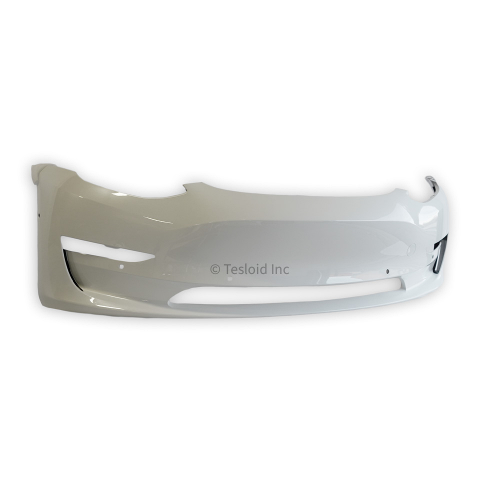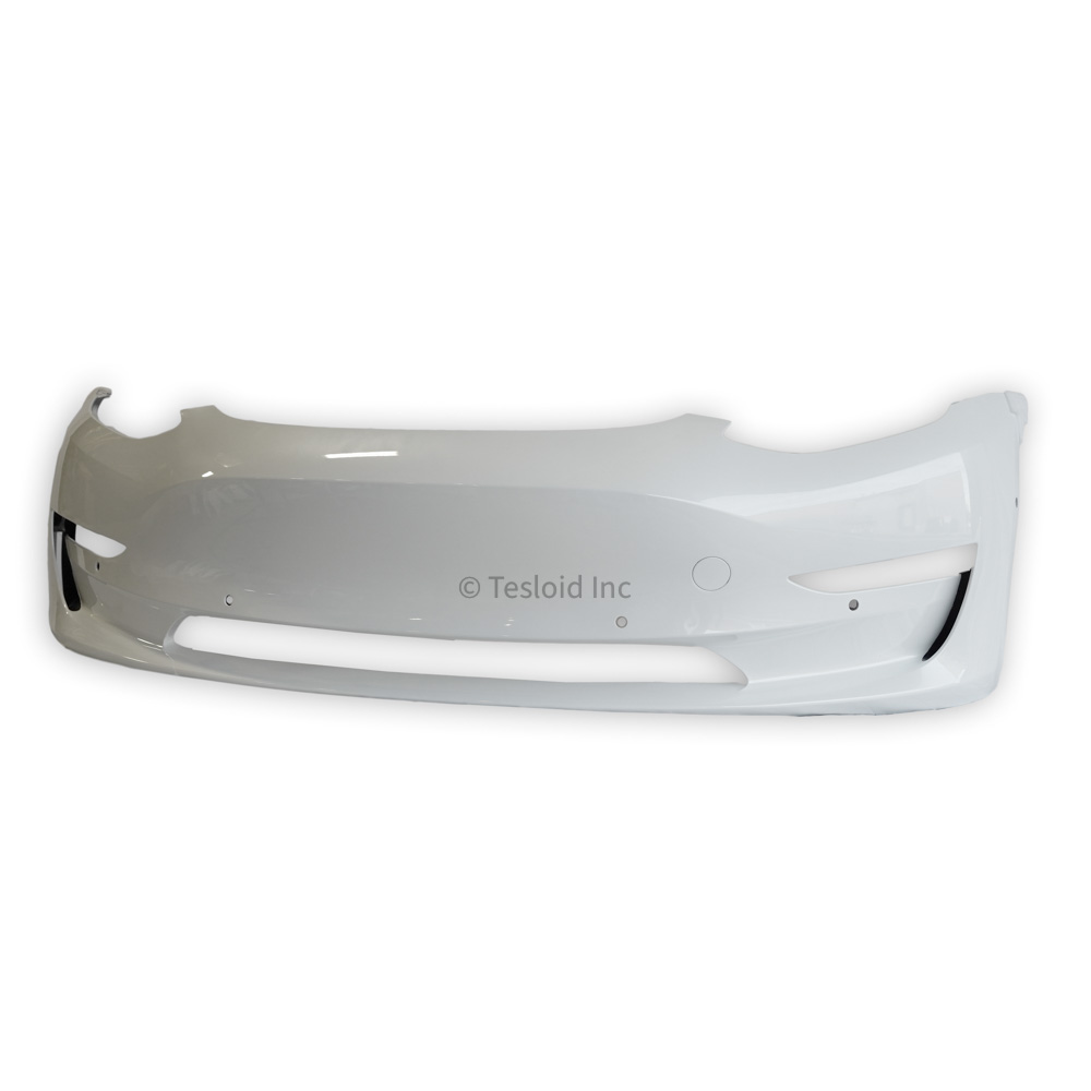 Tesla Model 3 Front Bumper with parking sensor holes for vehicles built before October 2022. This item ships un-folded.It is pre-painted Pearl White Multi-Coat with paint code PPSW.