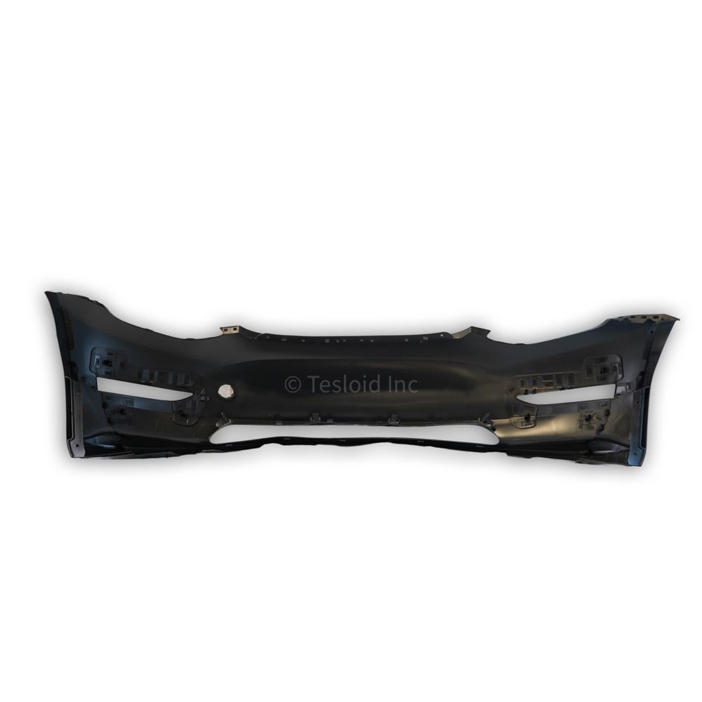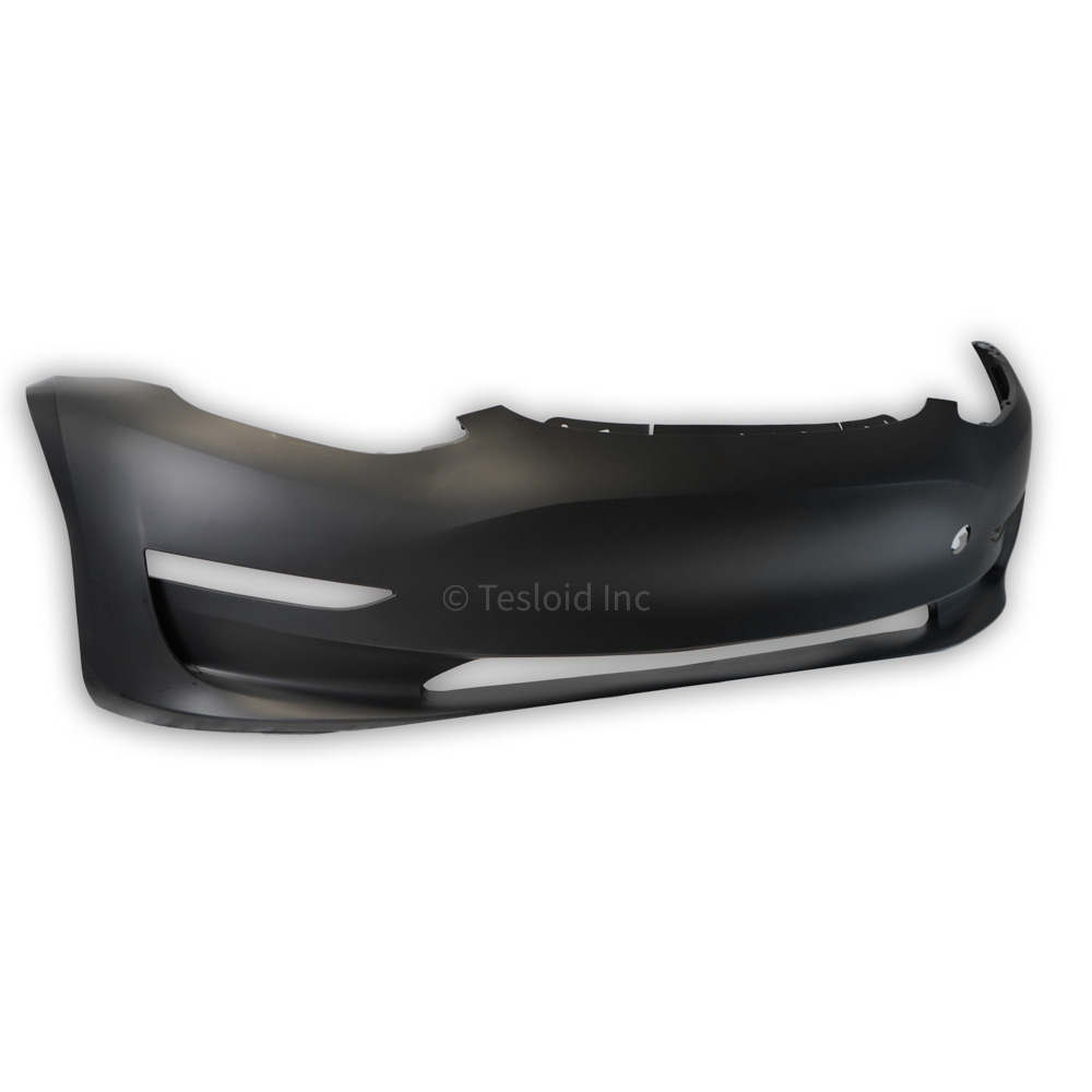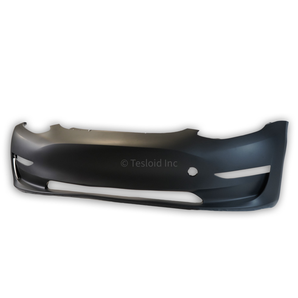 Tesla Model 3 Front Bumper without parking sensor holes. This part goes in the front outermost part of the Model 3. Starting in early October 2022, Model 3s are no longer built with ultrasonic sensors. This item ships un-folded.