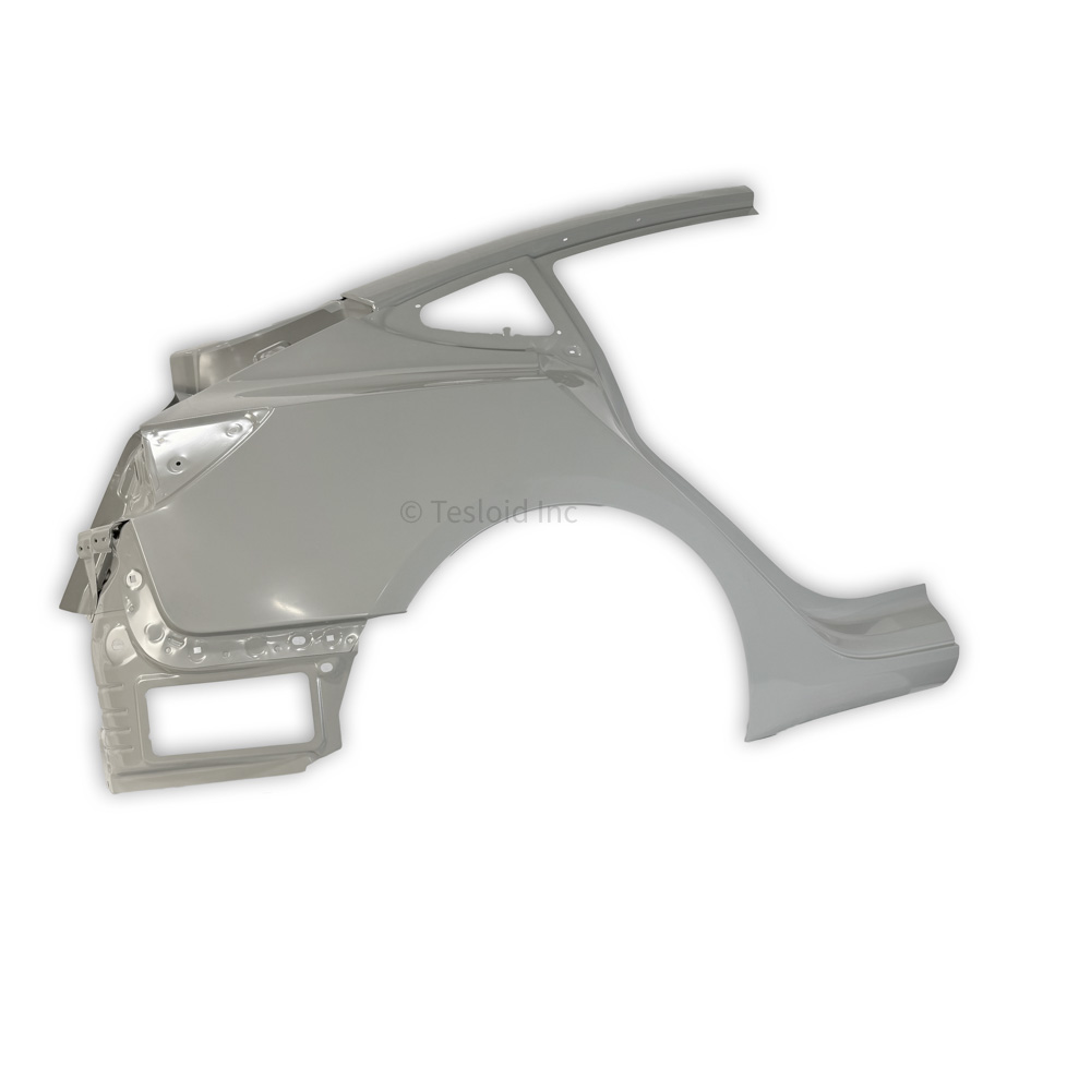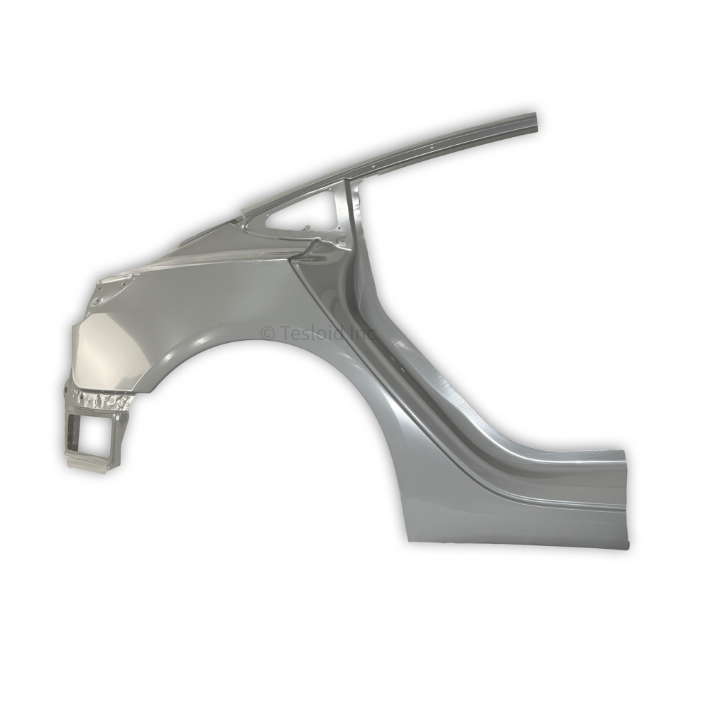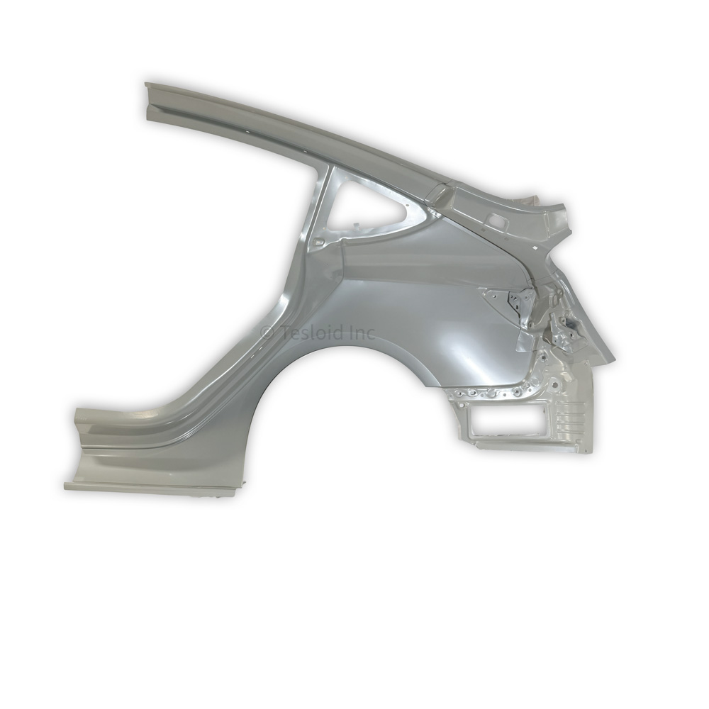 This part is the rear quarter panel that is mounted on the right side of the Tesla Model 3, in the area between the rear right door and the trunk.
