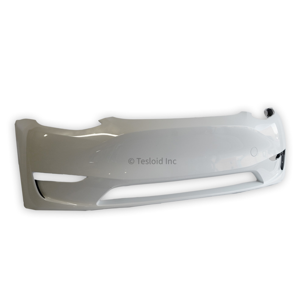 Tesla Model Y Front Bumper without parking sensor holes. Starting in early October 2022, Model Ys are no longer built with ultrasonic sensors. This item ships un-folded. It is pre-painted Pearl White Multi-Coat with paint code PPSW.