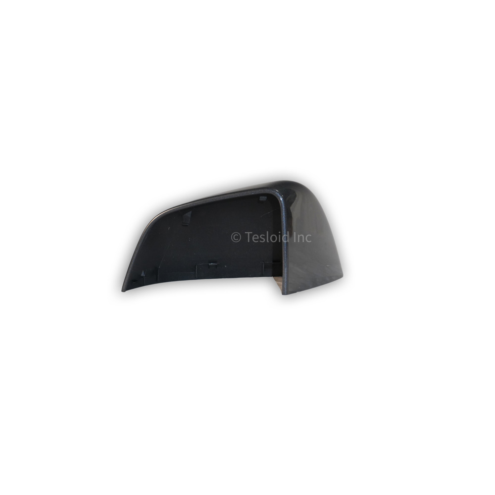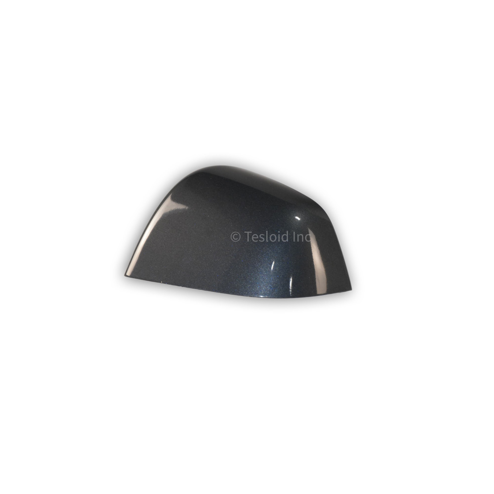 Silver left mirror cover of the Tesla Model Y. The skull caps go on top of the external mirror assembly to complete the side mirror assembly. The skull caps allow you to match mirror assembly to the color of the vehicle.
